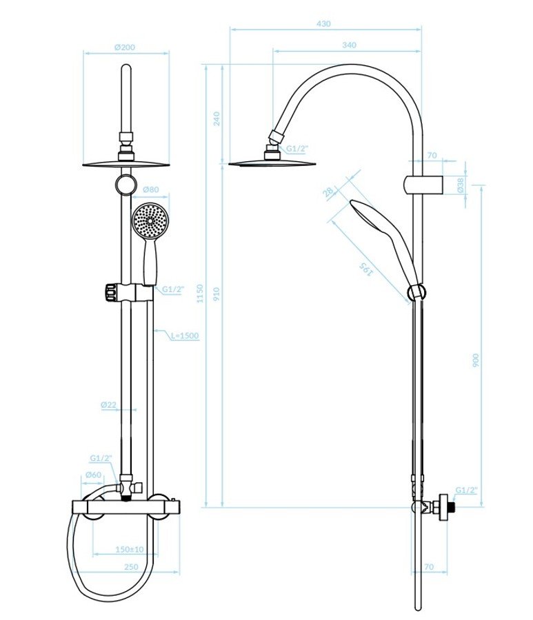Horná hlavica (tzv. „dážďová“) má priemer približne 200 mm, čo zabezpečuje širšie rozptýlenie vody a príjemný, relaxačný účinok počas sprchovania.Súčasťou stĺpa je ručná sprcha pripojená hadicou dĺžky 1500 mm, a tyč dĺžky 940 mm – čo poskytuje flexibilitu pri výške užívateľa a pohodlné nastavenie.