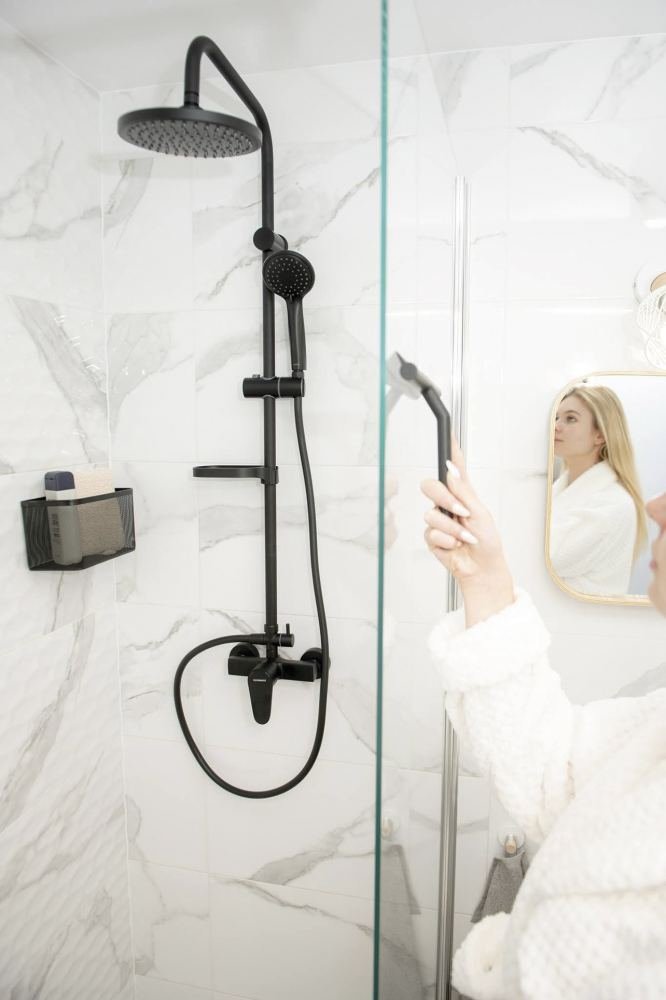 Model INTRA (kód PKI_70OB) od Kuchinoxu predstavuje vysoko funkčnú sprchovú súpravu, ktorá prináša harmonické spojenie dizajnu a komfortu. Súprava obsahuje pákovú batériu, hornú hlavicu s efektom dažďa (Ø 200 mm), ručnú sprchu s tromi režimami (dážďový, masážny, zmiešaný) a 1500 mm dlhú hadicu.