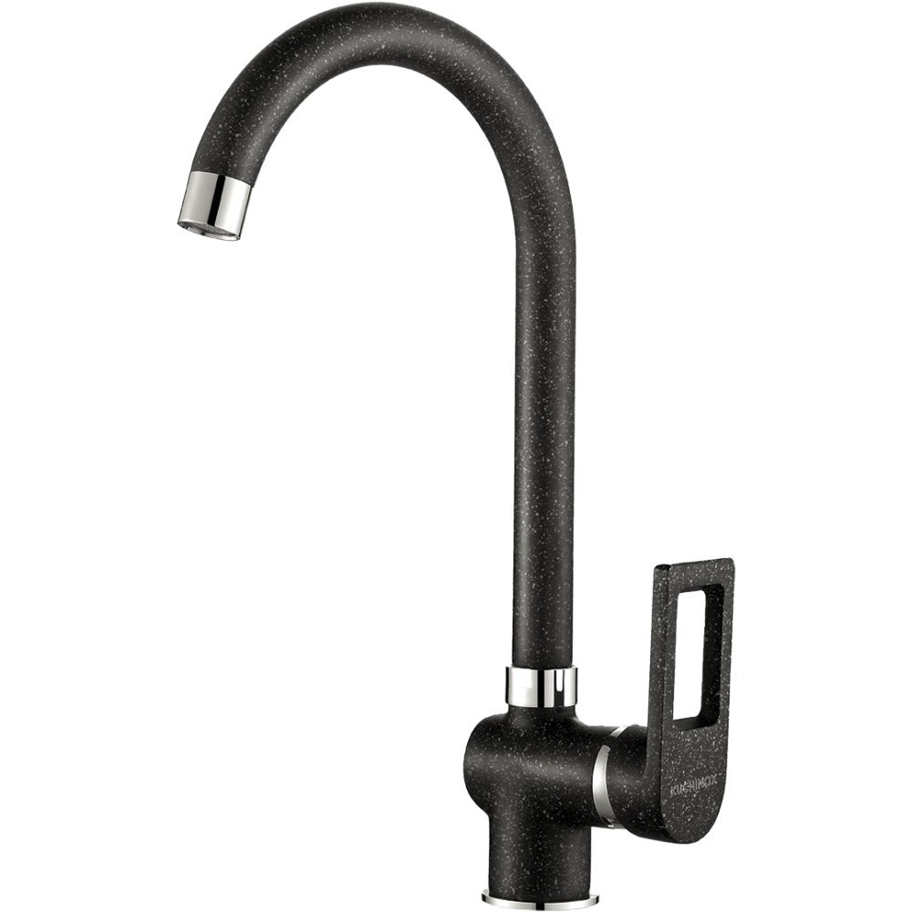 Moderná vysoká kuchynská batéria Kuchinox KASJA v čiernom granitovom vyhotovení so stojankovou montážou, otočnou výpustou v tvare „U“, keramickou hlavicou Ø 35 mm, triedou prietoku A (≤ 15 l/min) a akustickou triedou I (≤ 20 dB). Spoľahlivé riešenie pre štýlovú a funkčnú kuchyňu.