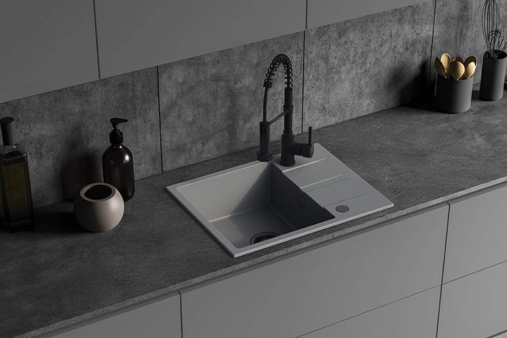 Elegantný granitový drez Laut od Kuchinox-u v jemnej sivej farbe – jednokomorový model s odkvapkávačom, vhodný pre spodnú skrinku od 50 cm. Ideálny pre moderné kuchyne, kde sa kladie dôraz na vzhľad aj funkčnosť.