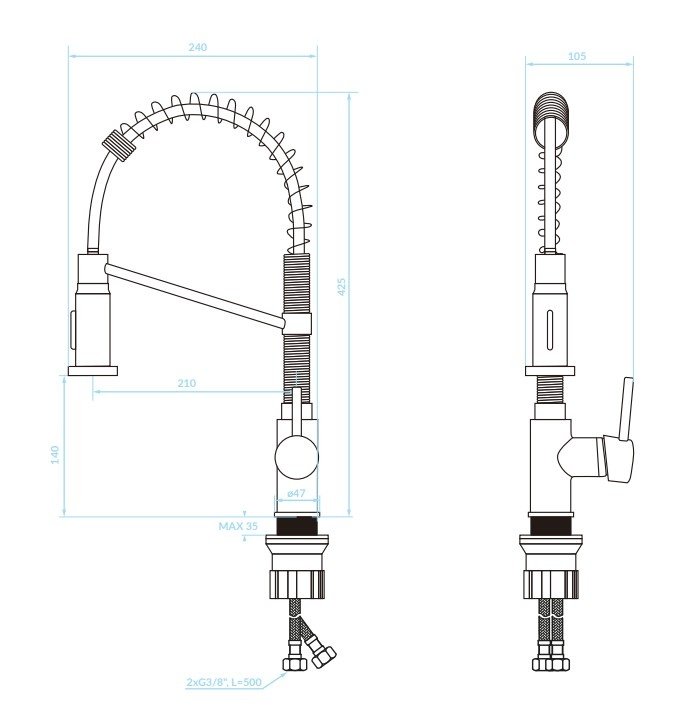 Telo batérie v lesklom chróme pôsobí nadčasovo a hodí sa k širokej škále kuchynských zariadení. Vysoká výška 425 mm vám umožňuje pohodlnú manipuláciu s nádobami nad drezom. Výraznou prednosťou je pružinové rameno výtoku, ktoré sa voľne ohýba a vracia späť – ideálne pri oplachovaní riadu, plnení hrncov či manipulácii s výtokom v rôznych polohách.
