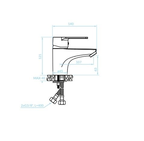 Batéria má pevný výtok (neotočný) s dosahom 107 mm, ideálnym pre bežné umývadlá. Výška batérie je 121 mm, čo poskytuje dostatočný priestor pre bežné umývanie.