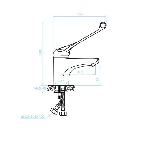 Celkovo má výšku 195 mm, čo z nej robí kompaktnú voľbu vhodnú aj na menšie umývadlá. Dosah výtoku 107 mm zabezpečuje, že voda dopadá bližšie k stredu misy, čo zlepšuje komfort pri použití. Hadice s dĺžkou 40 cm zabezpečujú flexibilné zapojenie bez nutnosti predlžovania.