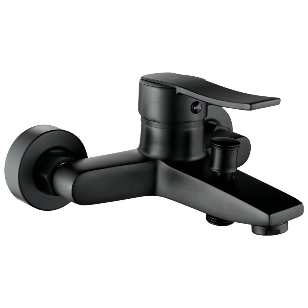 Čierna stenová vaňová batéria Kuchinox Madera s jednopákovým ovládaním a keramickou hlavicou Ø 40 mm. Pevný výtok s dosahom 154 mm, tichá prevádzka, trieda prietoku A ≤ 15 l/min. Bez priloženého sprchového setu – možnosť doplniť podľa potrieb.