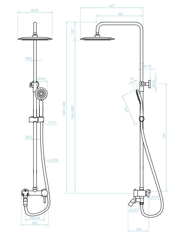 Kolóna disponuje otočným vaňovým výtokom – čo znamená, že môžete výtok nasmerovať tak, ako potrebujete, či už sprchujete alebo plníte vaňu. Výška zariadenia je nastaviteľná v rozsahu 880–1200 mm, čo poskytuje flexibilitu pri rôznych výškach montáže a umožňuje lepšie prispôsobenie priestoru. Horná “dážďová” hlavica má priemer Ø 225 mm, čím sa dosahuje široký a príjemný prúd vody, ktorý zahŕňa celú hornú časť tela – efekt príjemného zaháňania vodou.