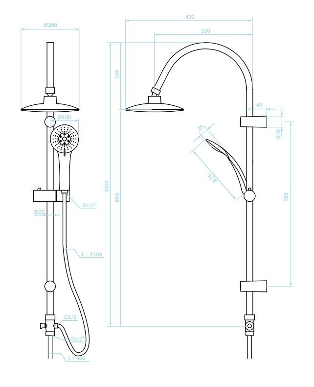 Horná sprcha s priemerom Ø 200 mm poskytuje rovnomerný „dažďový“ prúd vody, ktorý vás obklopí a umožní relax po náročnom dni. Ručná sprcha má rozmery 225 × 100 mm, a ponúka tri režimy prúdu: dážď, masáž a zmiešaný. Dĺžka tyče 950 mm zabezpečuje pohodlné uchytenie sprchovej hlavice v rôznych výškach používateľa. Hadica s dĺžkou 1500 mm umožňuje priestorovo pohodlné sprchovanie.