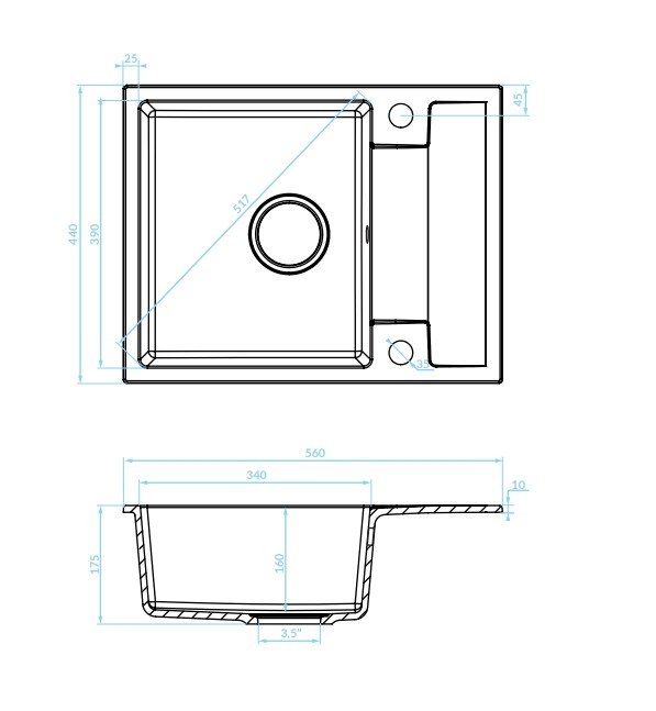 Drez má rozmery 560 × 440 × 175 mm, čo v spojení s hĺbkou misy približne 160 mm poskytuje dostatočný priestor pre umývanie riadu, veľkých hrncov či prípravu potravín. Polovičný odkvapkávač je praktickým doplnkom – ponúka pracovnú plochu vedľa misy, ideálnu na sušenie riadu alebo odkladanie čerstvo umytého kuchynského náčinia.