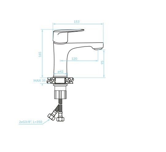 Batéria je navrhnutá na montáž priamo na umývadlo, čo umožňuje čistý estetický vzhľad bez potrubí viditeľných na stene. Pevný výtok so dosahom 120 mm zaručuje dostatočný priestor nad umývadlom, čo uľahčuje umývanie rúk, tváre alebo viečok s komfortom.
