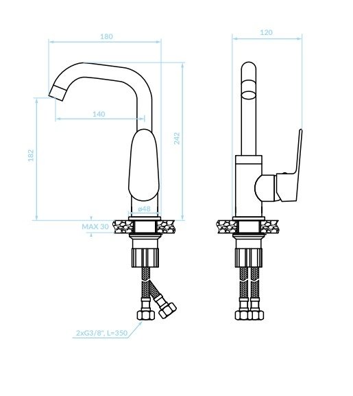 Batéria sa montuje priamo na dosku umývadla šikovne bez nutnosti nástenných vývodov. Jej výtok s dĺžkou 140 mm poskytuje dosah, ktorý umožňuje pohodlné umývanie rúk, tváre či manipuláciu s nádobou bez dotyku s okrajom umývadla. Výška 242 mm dodáva batérii výrazný profil, ktorý vynikne v moderných kúpeľniach.