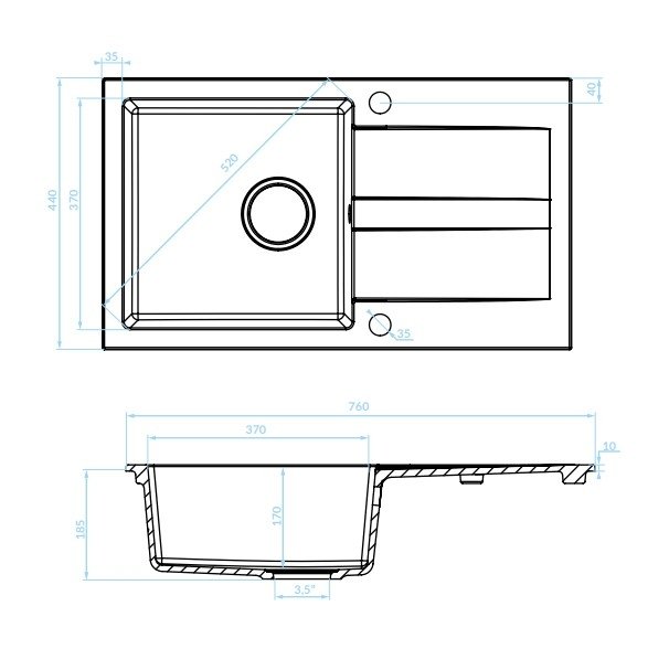 Drez má rozmery 760 mm dĺžka × 440 mm šírka × 185 mm výška. Hĺbka komory je približne 170 mm, čo poskytuje pohodlný priestor aj pre väčšie riady či hrnce. Integrovaný odkvapkávač ponúka miesto na sušenie riadu alebo odkladanie mokrých hrncov – čím šetrí drahocenný priestor na pracovnej doske.