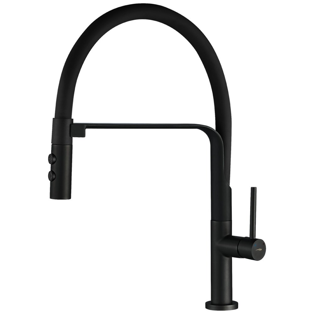 Moderná a nadčasová kuchynská batéria SILUETTO od Kuchinox v matnej čiernej farbe, s výším telom a flexibilným „U“-výtokom. Ponúka elastické rameno s magnetickým uchytením, dva režimy prúdu (normálny a “dážďový”), nízku spotrebu vody (≤ 9 l/min) a tichý chod (≤ 20 dB). Ideálne riešenie pre štýlovú a funkčnú kuchyňu.