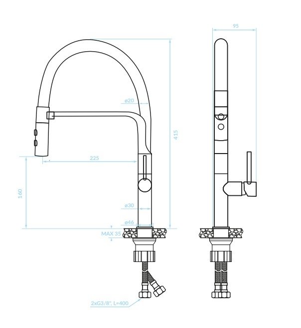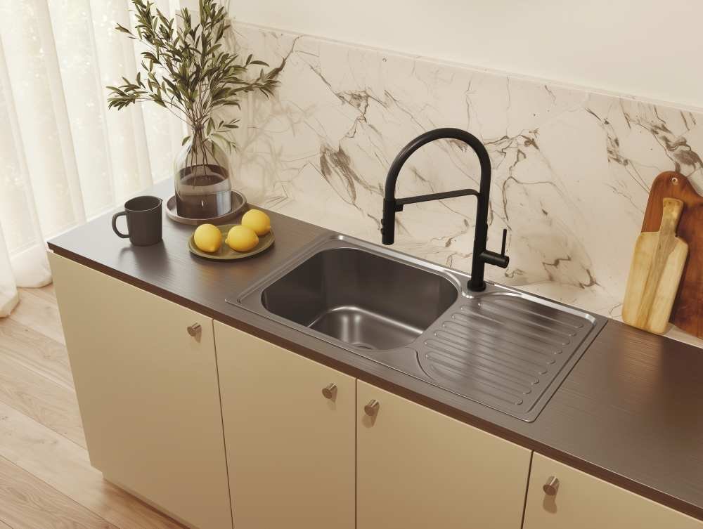 Batéria v matnej čiernej farebnej kombinácii pôsobí prémiovo a súčasne nadčasovo – ideálne pre kuchyne s moderným, minimalistickým alebo industriálnym štýlom. Telo batérie je štíhle, výška 415 mm poskytuje výraznú prítomnosť nad drezom, čím sa stáva nielen funkčným prvkom, ale aj dizajnovým doplnkom.