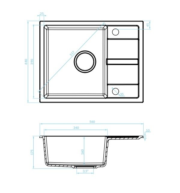 Hĺbka komory cca 160 mm, umožňuje pohodlne manipulovať s väčším riadom či hrncami. Drez obsahuje políčko odkvapkávača – praktický priestor na sušenie alebo odkladanie mokrého riadu, čo v menšej kuchyni oceníte.