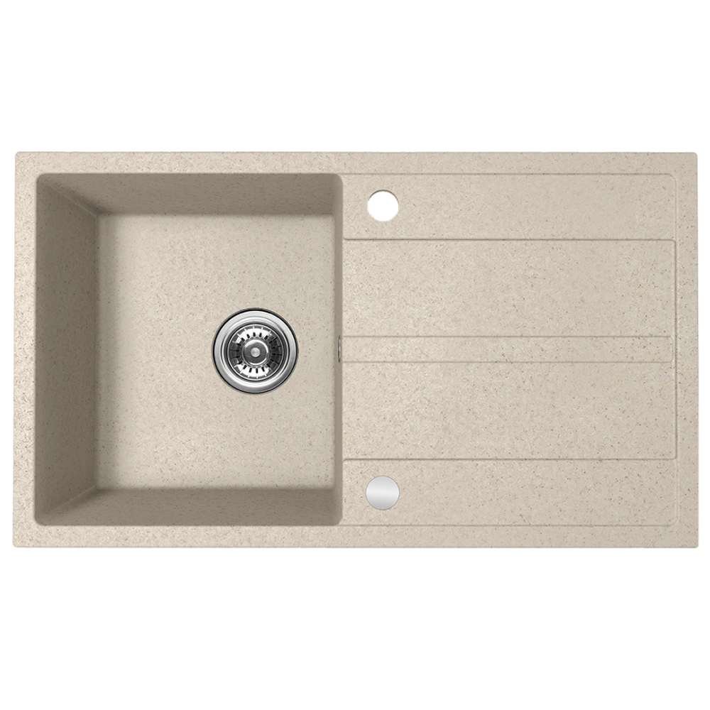 Elegantný granitový drez VITI od značky Kuchinox v teplej béžovej farbe – jeden priestranný priestor na umývanie, odkvapkávač, montáž na skrinku od 50 cm – spojenie štýlu a funkčnosti pre vašu kuchyňu.