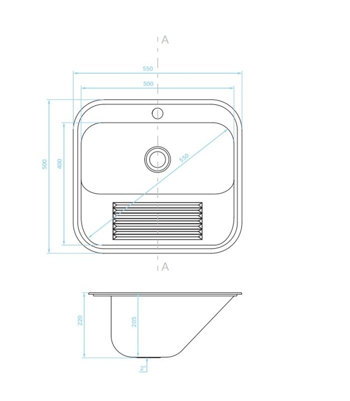 Robustný technický drez Kuchinox CHIOS SKN_090D v rozmere 550 × 500 mm s hlbokou komorou (~220 mm) a inox povrchom — ideálny pre garáže, práčovne či dielne, kde je dôležitá funkčnosť a odolnosť.