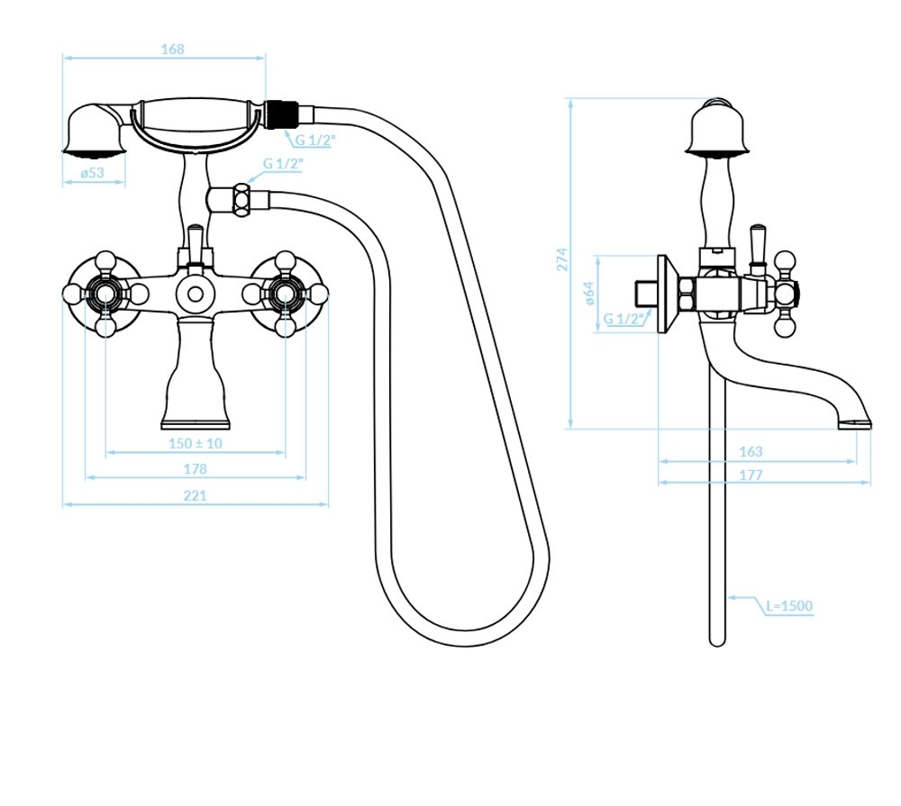 STILO nástenná vaňová batéria so sprchovým setom v mosadz prevedení s retro dizajnom prináša spojenie tradičného štýlu a spoľahlivej funkčnosti.