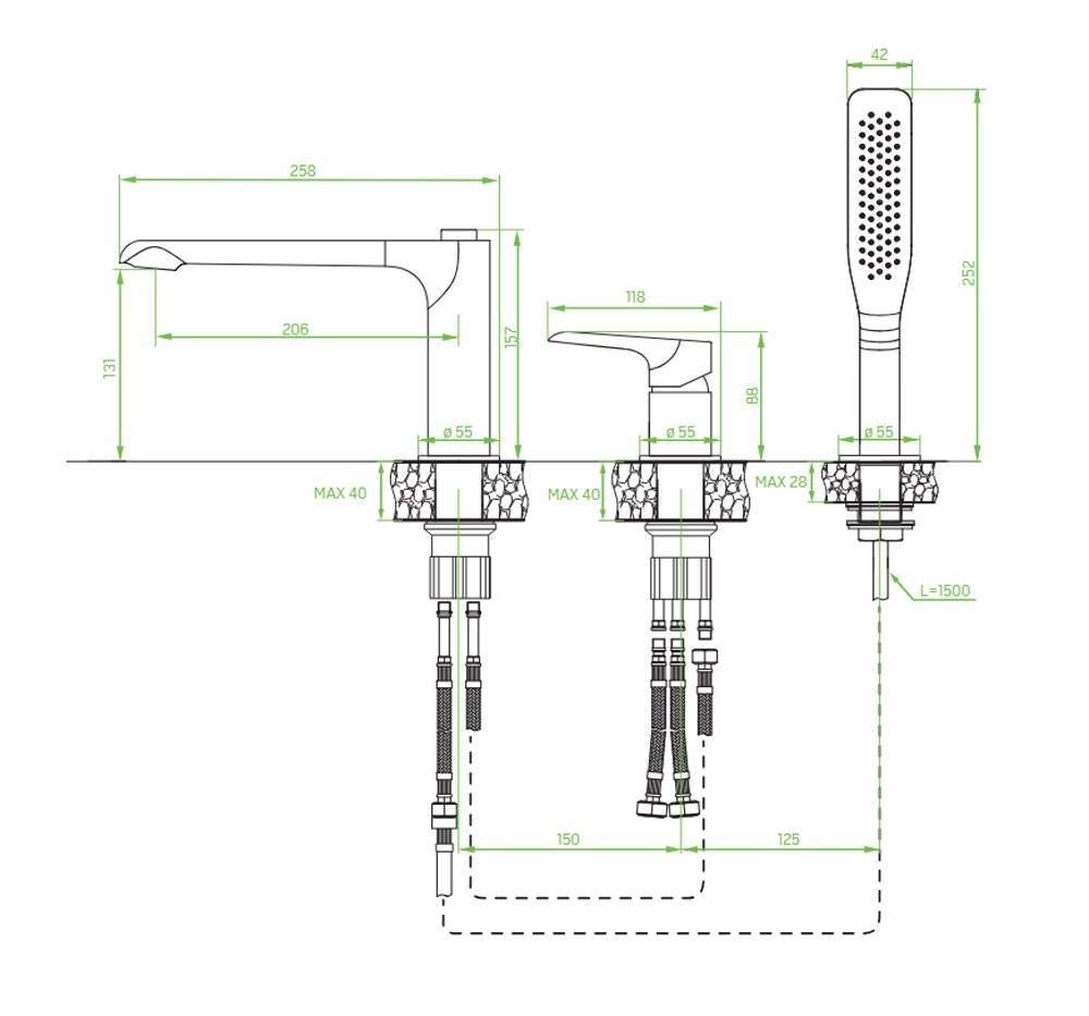 Montáž: stojace prevedenie s trojotvorovou inštaláciou – vhodné pri vanách s prípravou na 3 otvory