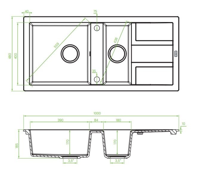 Rozmery celého drezu sú 1000 × 480 × 185 mm (dĺžka × šírka × výška). Hĺbka komôr je približne 170 mm.