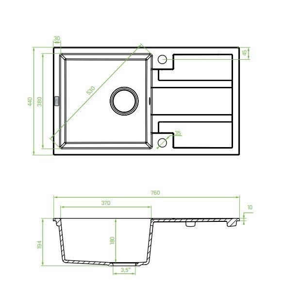 Jednokomorový model s odkvapkávačom v nadčasovom čiernom odtieni je určený na zapustenú montáž s možnosťou obojstranného otočenia (pravá/ľavá strana) a je predvŕtaný na batériu.