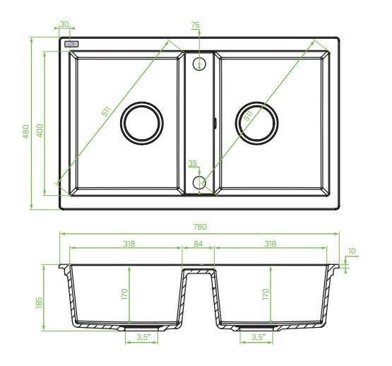 Drez má 2 komory bez odkvapkávača, čo poskytuje väčšiu flexibilitu pri umývaní aj oplachovaní nádob. Vonkajšie rozmery sú 780 × 480 × 185 mm (dĺžka × šírka × výška) a hĺbka každej komory je približne 170 mm. Rozmery komôr sú uvádzané približne ako 400 × 318 × 170 mm. Prednosti: montáž zapustením (horná montáž) do pracovnej dosky, možnosť symetrického (pravého/ľavého) usporiadania, predvŕtané otvory pre batériu, automatická zátka, priemer odtoku 3,5″ a pripojenie pre umývačku riadu.