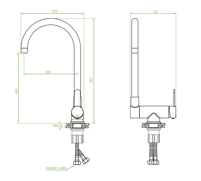 Stojaca kuchynská batéria Laveo Bona s výpustom tvaru „U“ dĺžky 200 mm prináša výhodu sklápateľného ramena — ideálna verzia pre montáž pri okne. Má jednouchytové ovládanie, keramickú kartušu 35 mm, a je vyrobená z nerezovej ocele v brúsenom (satin) prevedení. Celková výška batérie je 395 mm, prívodné hadice majú dĺžku 500 mm.
