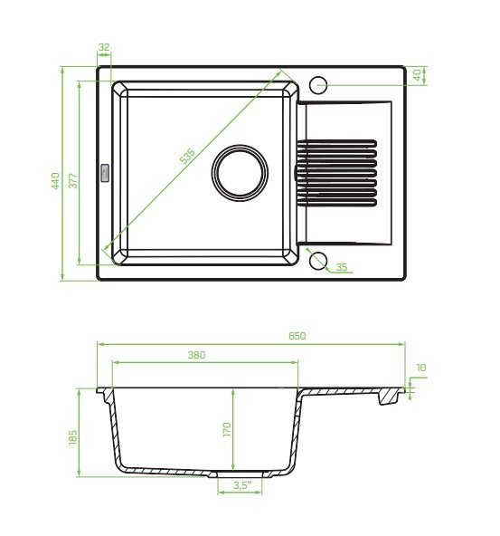 Rozmery celého drezu sú 650 × 440 × 185 mm (dĺžka × šírka × výška). Hĺbka komory je približne 170 mm. Predurčený pre spodnú skrinku s minimálnou šírkou 500 mm.