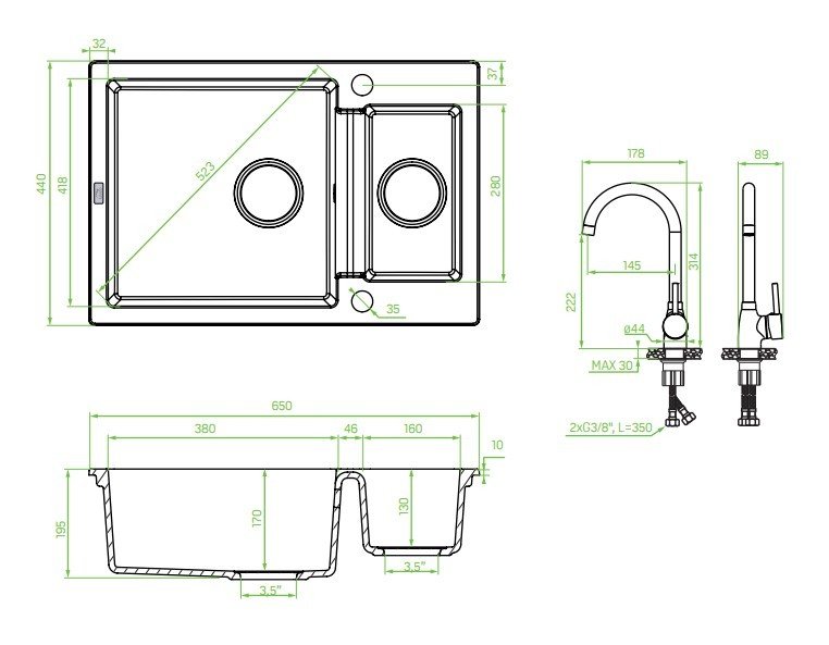Typ: granitový kuchynský drez 1,5-komorový s batériou v sade.