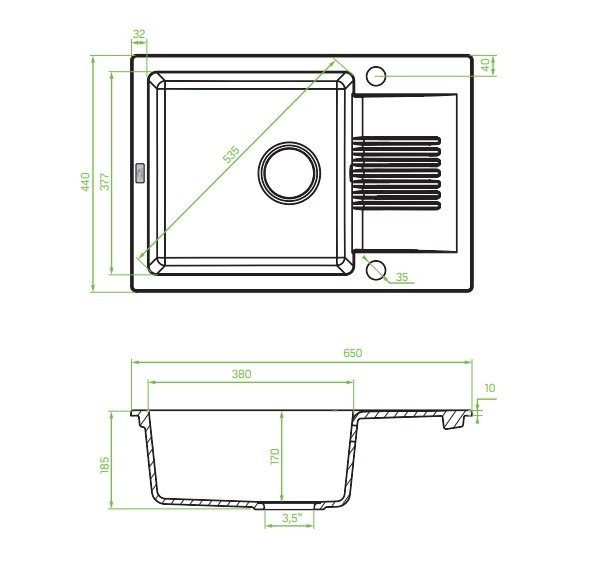 Rozmery 650 × 440 mm a hĺbka komory cca 170 mm poskytujú dostatočný priestor aj pre väčšie riady a zároveň zostávajú vhodné aj do štandardnej skrinky od 50 cm šírky. Odkvapkávacia plocha poskytuje praktický priestor na odloženie umytého riadu alebo očistených hrncov bez potreby ďalšieho vybavenia.