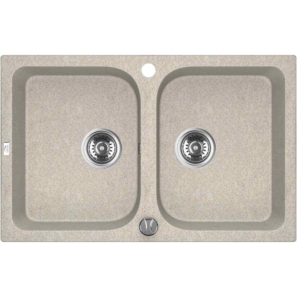 Moderný granitový drez Laveo Celia (kód SBC_420T) v elegantnej béžovej farbe, s dvoma komorami, bez odkvapkávača, vhodný pre spodnú skrinku od 80 cm. Vyrobený z odolného granitu, v balení obsahuje automatickú zátku a priestorovo úsporný sifón, pripravený na pripojenie umývačky riadu.