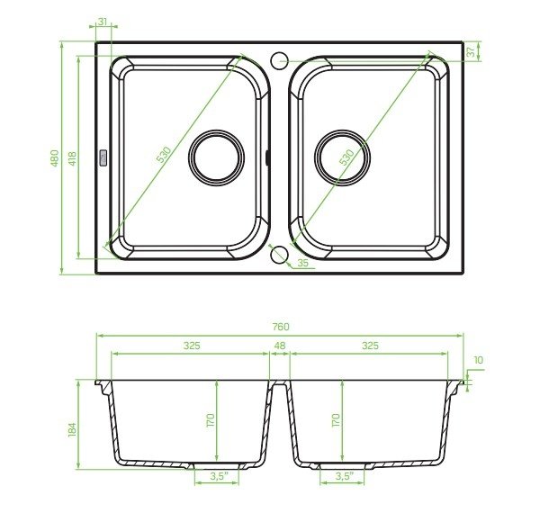 Drez má dve komory, čo umožňuje efektívnejšie rozdelenie pracovnej plochy – napríklad jednu komoru na umývanie a druhú na oplach alebo predprípravu. Vonkajšie rozmery sú 760 × 480 × 184 mm (dĺžka × šírka × výška) podľa viacerých zdrojov. Hĺbka komôr je približne 170 mm. Montáž je zapustením (horná montáž) s možnosťou obojstrannej orientácie (pravá/ľavá).