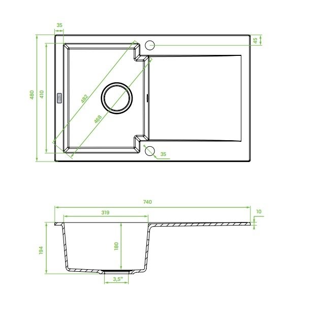 Rozmery 740 × 480 mm (dlžka × šírka) a hĺbka komory približne 180 mm zabezpečujú komfortné umývanie aj väčších hrncov či riadu. Drez je vybavený odkvapkávačom — ideálne miesto pre sušenie riadu alebo odkladanie mokrých predmetov — čím zvyšuje praktickú hodnotu a efektivitu práce.