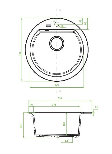 Rozmery celku 510 × 510 mm (šírka × hĺbka) a výška cca 205 mm (resp. 205 mm podľa zdroja) zabezpečujú, že drez sa pohodlne zmestí do spodnej skrinky od minimálne 500 mm šírky. Misa má údajne rozmery približne 375 × 430 × 190 mm (dĺžka × šírka × hĺbka) podľa jedného zdroja.