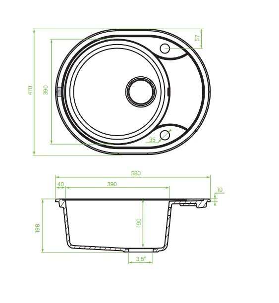 Rozmery celku 580 mm (dĺžka) × 470 mm (šírka) × 198 mm (výška) dávajú dostatok voľného priestoru pre umývanie väčších hrncov či panvíc. Komora má hĺbku približne 190 mm, čo je výborné pre hlbšie riady. Drez je vybavený predvŕtaným otvorom pre batériu a automatickou výpustnou zátkou typu 3,5″ – tento systém zjednodušuje odtok a zabraňuje zanášaniu. Priestorovo úsporný sifón v balení umožňuje využiť priestor pod drezom efektívnejšie – napríklad pre odpadkový kôš alebo organizér na čistiace prostriedky. Vďaka robustnému granitu je drez odolný voči teplotným šokom, poškriabaniu a zafarbeniu – investícia, ktorá vydrží.