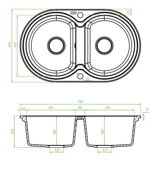 Rozmery celku sú 780 mm (dĺžka) × 470 mm (šírka) × 204 mm (výška), pričom hĺbka každej komory je približne 190 mm. Model je určený pre spodnú skrinku s minimálnou šírkou 800 mm (80 cm).