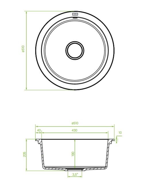 Rozmery 510 × 510 × 205 mm (šírka × hĺbka × výška) zabezpečujú komfortné umiestnenie v spodnej skrinke s minimálnou šírkou 50 cm. Komora má hĺbku približne 190 mm, čo umožní pohodlné umývanie väčšieho riadu. Produkt je vybavený odtokom 3,5-palcovým (≈ 90 mm) a priestorovo úsporným sifónom typu „Space-Saving“, čím sa umožní efektívnejšie využitie skriniek pod drezom, napríklad na odpadkový kôš alebo úložné riešenie.
