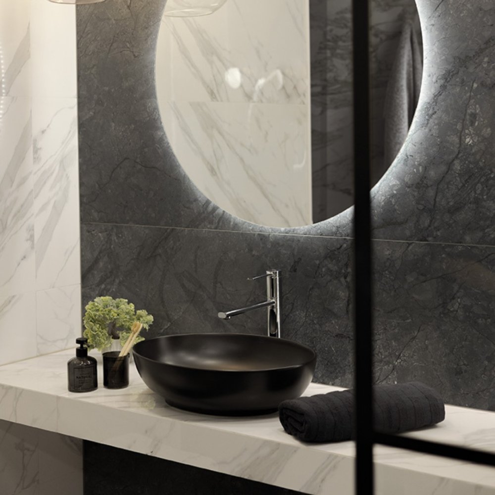 Elegantné umývadlo na dosku Laveo Desna v rozmere 515 × 395 × 135 mm (šírka × hĺbka × výška misy) prináša moderný a nadčasový štýl do každej kúpeľne. Vyrobené z kvalitnej sanitárnej keramiky s matným čiernym povrchom, odolným proti zafarbeniu a ľahko udržiavateľným. Montáž na dosku umožňuje efektívne využitie priestoru a kombináciu s vysokou stojankovou alebo podomietkovou batériou.
