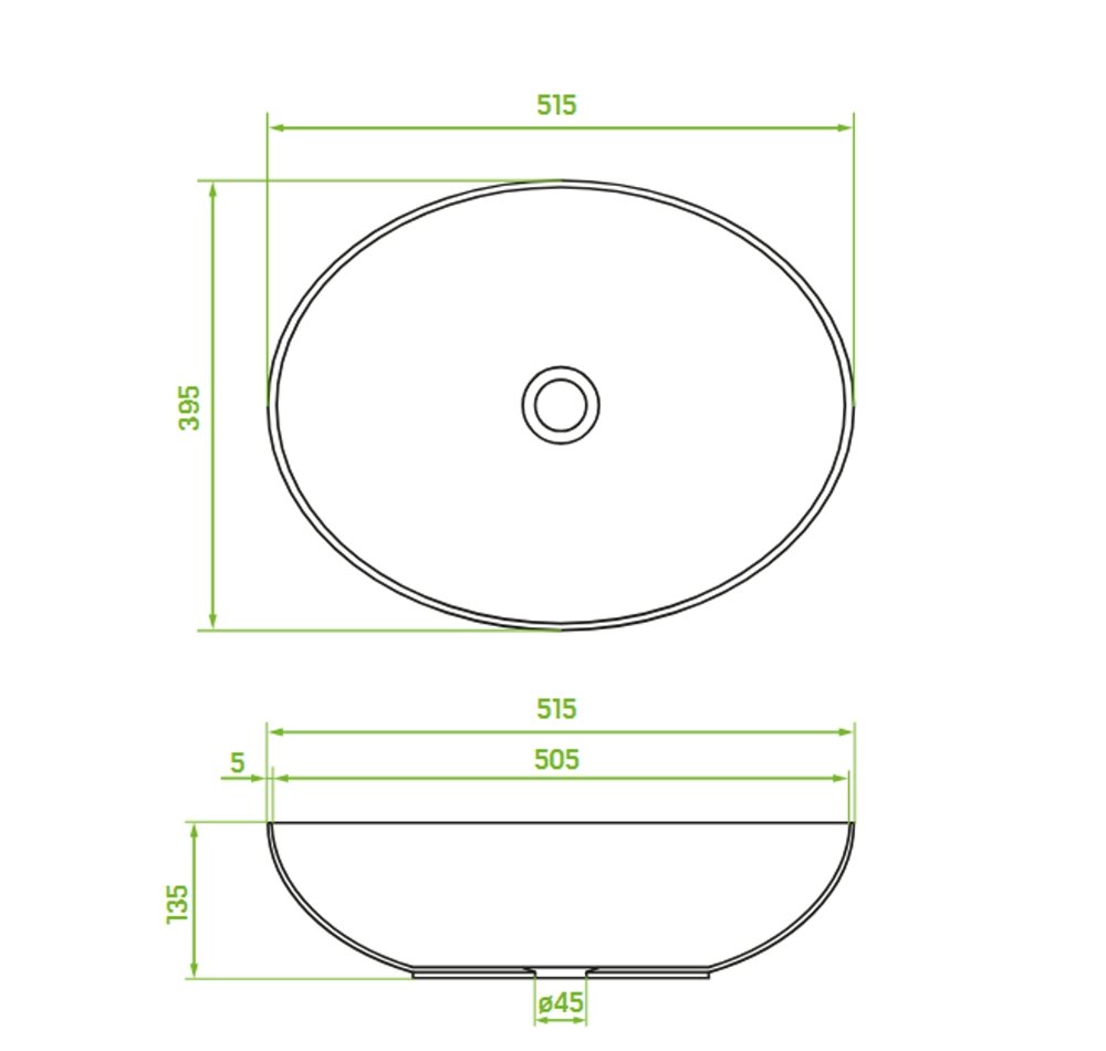 Rozmery: šírka 515 mm × hĺbka 395 mm × výška misy 135 mm