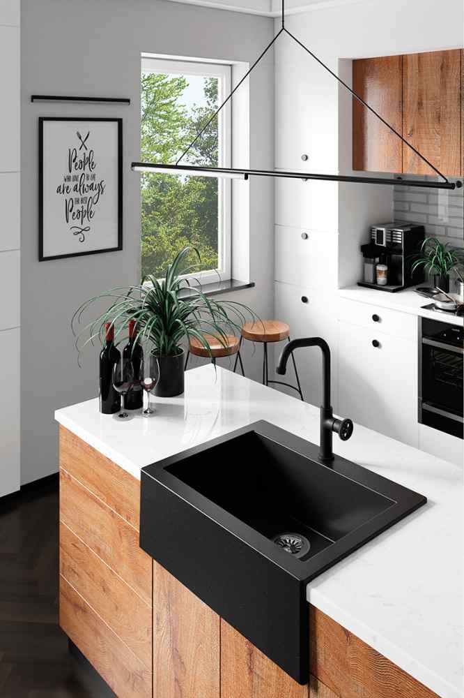 Estetika: Čierna farba s jemnou štruktúrou kameňa sa ľahko zladí s kuchynskou linkou v škandinávskom, provensálskom, alebo modernejšom štýle. Model Komodo je dizajnovo výrazný, ale zároveň nadčasový.