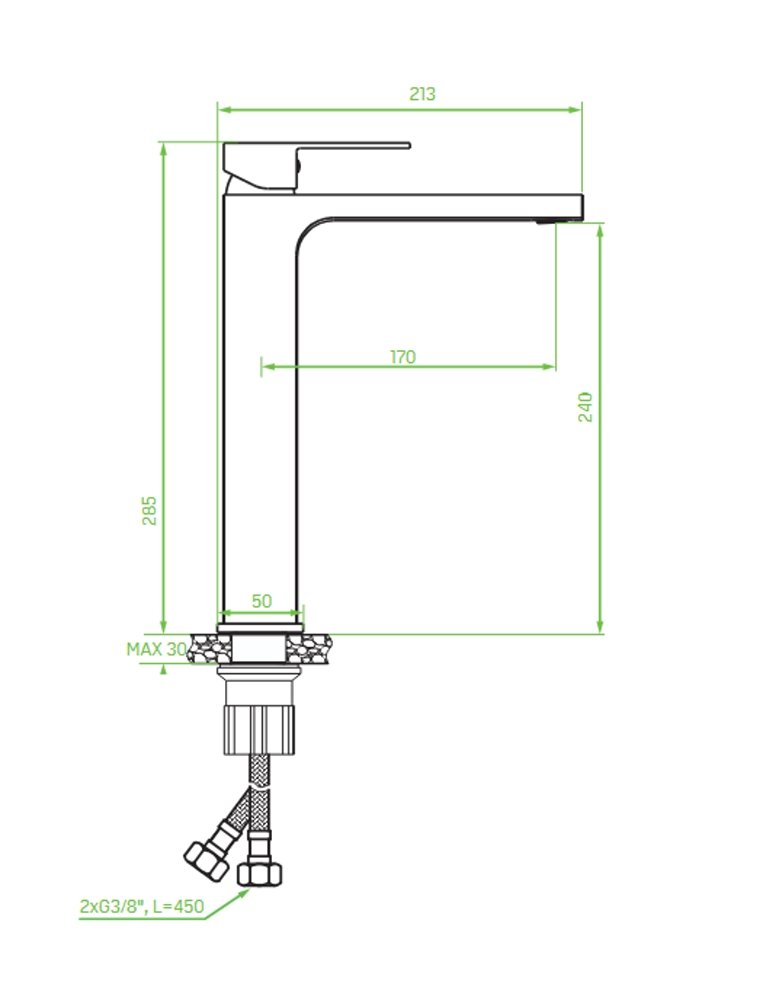 Predstavujeme stojacu umývadlovú batériu Laveo Kvadrato – model série Kvadrato s výrazným geometrickým dizajnom, ideálny pre umývadlá umiestnené na skrinke alebo doske. Batéria sa vyznačuje vysokým telom (285 mm), výtokom so zdvihom 170 mm a modernou úpravou chróm. Je osadená keramickou hlavicou Ø 35 mm a vybavená výpustom typu klik-klak. Montáž je jednoduchá a flexibilná vďaka prívodným hadičkám dĺžky 450 mm.