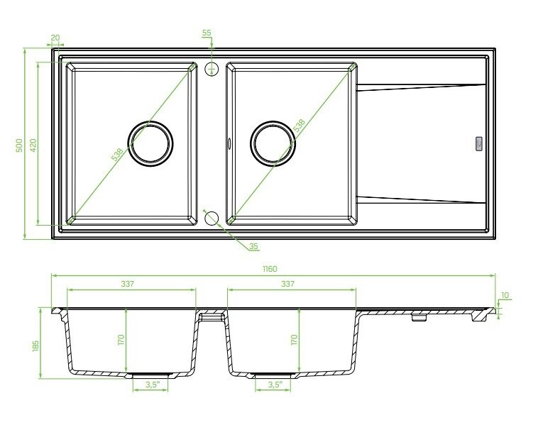 Rozmery a priestor: Celkové rozmery približne 1160 × 500 mm, výška (resp. hrúbka) cca 185 mm. Hlbka komôr je cca 170 mm. Skrinka pod drez by mala mať minimálne šírku 900 mm, aby montáž prebehla bez kompromisov.