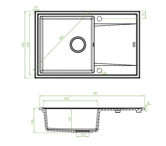 Jeho celkové rozmery približne 780 mm dĺžka × 500 mm šírka × 185 mm výška (resp. hĺbka misa cca 170–185 mm) zaručujú, že máte dostatok priestoru pre umývanie väčších hrncov a panvíc, pričom odkvapkávač poskytuje dodatočnú plochu pre odkladanie riadu či sušenie.