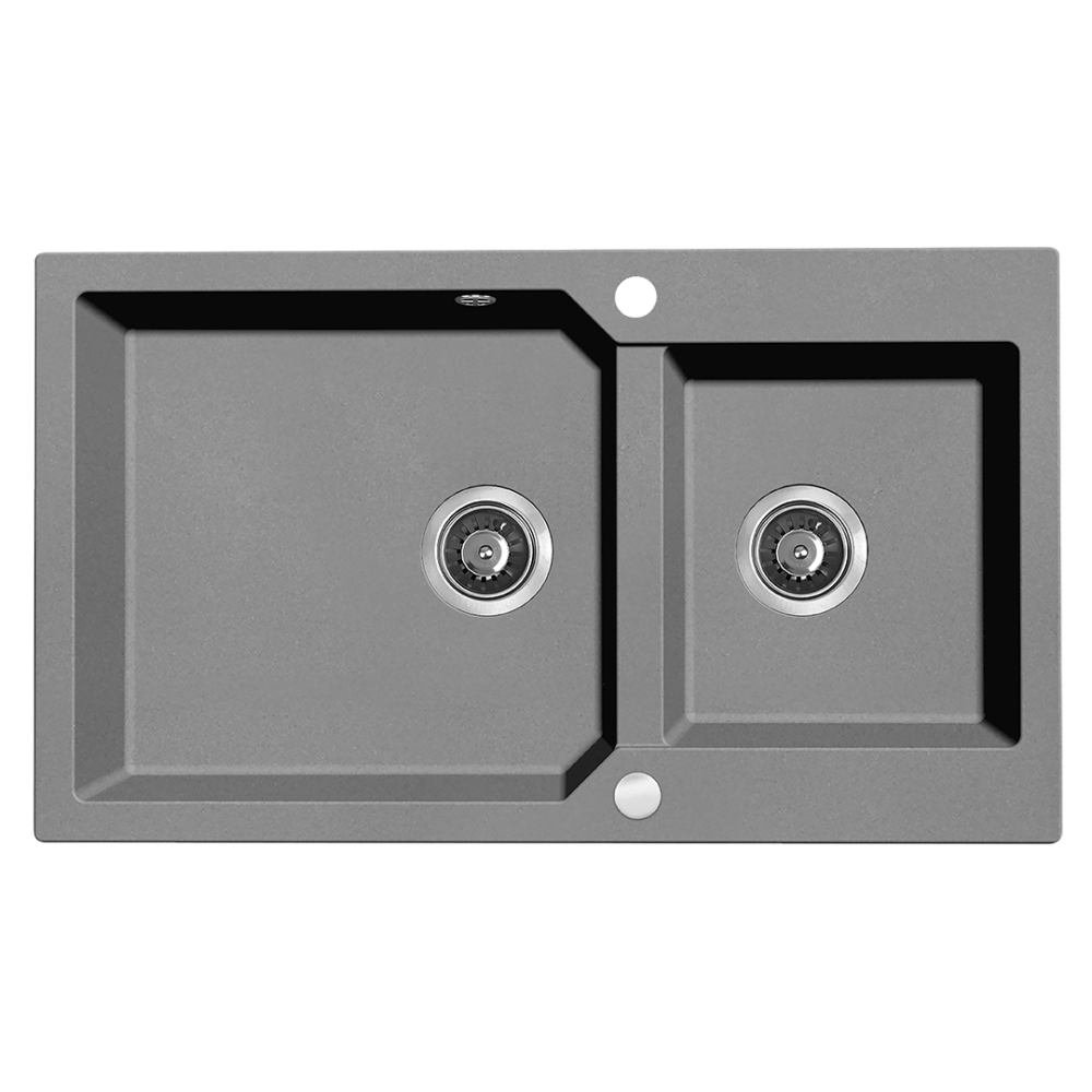 Moderný 2-komorový granitový drez Milos v sivej farbe – rozmery 860 × 500 mm, hlboké mycie komory (~200 mm), materiál granitová zmes, flexibilná orientácia podľa kuchyne, súčasťou odtok + sifón, vhodný pre skrinku od 90 cm