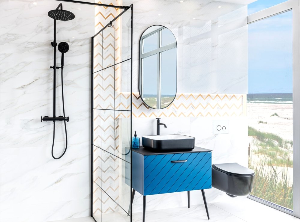 Elegantný obdĺžnikový tvar so zaoblenými rohmi pôsobí nadčasovo a hodí sa do minimalistických aj industriálnych kúpeľní. Lesklý biely povrch s čiernym orámovaním vytvára pôsobivý kontrast, ktorý okamžite upúta pozornosť.