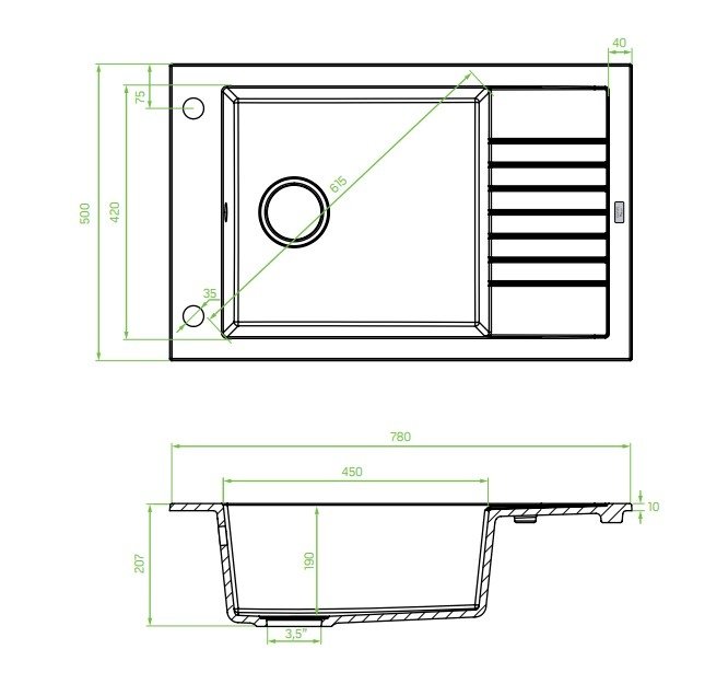 Obsahuje sifón šetriaci miesto a odtok s priemerom 3,5″ – štandardné riešenie pre kuchynské drezy tejto kategórie.