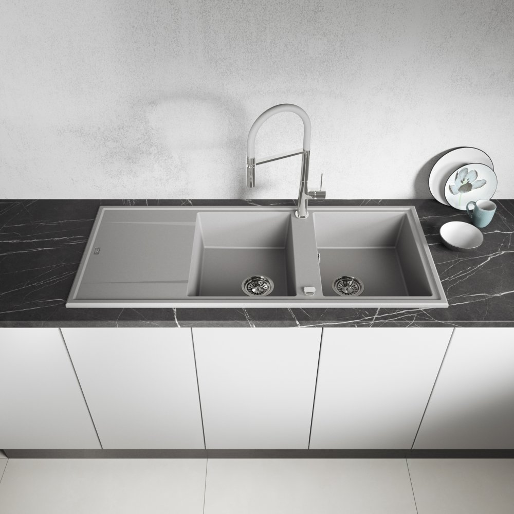 Luxusná kuchynská batéria Laveo Pola stojaca s výtokovou pákou v tvare “U” predstavuje elegantné riešenie pre modernú kuchyňu. Jej značkou je vysoký výtokový oblúk (dosah 200 mm), keramická hlavica Ø 25 mm, montáž na pracovnú dosku a povrchová úprava v kombinácii chrómu a sivej farby.