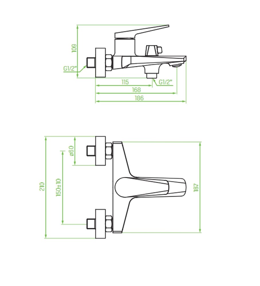 Výtoková vylievka: dosah cca 168 mm – dostatočný dosah nad vaňou, zamedzuje stekaniu vody po okraji vane