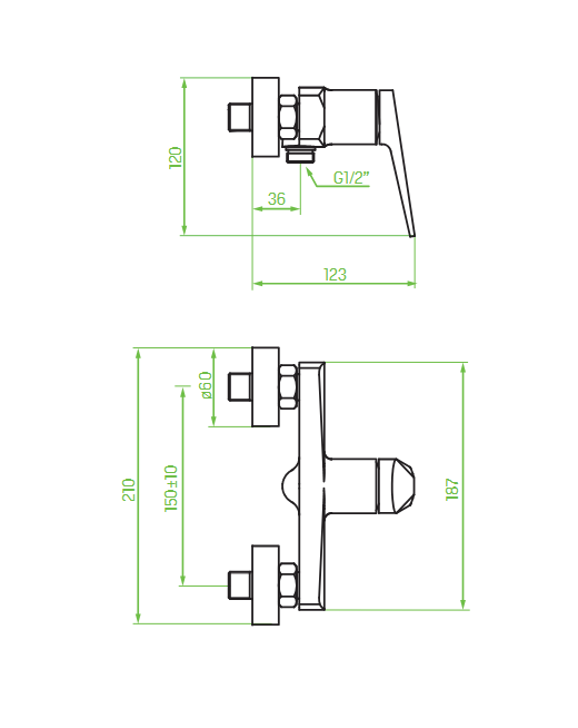 Hĺbka (výstup sprchy) = 123 mm; celková výška batérie = 120 mm