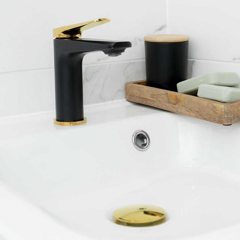 Objavte vysokokvalitnú stojacu umývadlovú batériu Laveo Rubio s integrovaným klik-klak výpustom. Výrazné spojenie čierneho tela a zlatej páky dodáva kúpeľni luxusný a moderný vzhľad. Model je jednoúchytový, pripravený na montáž na umývadlo s predvŕtaným otvorom – ideálne riešenie pre vašu kúpeľňu
