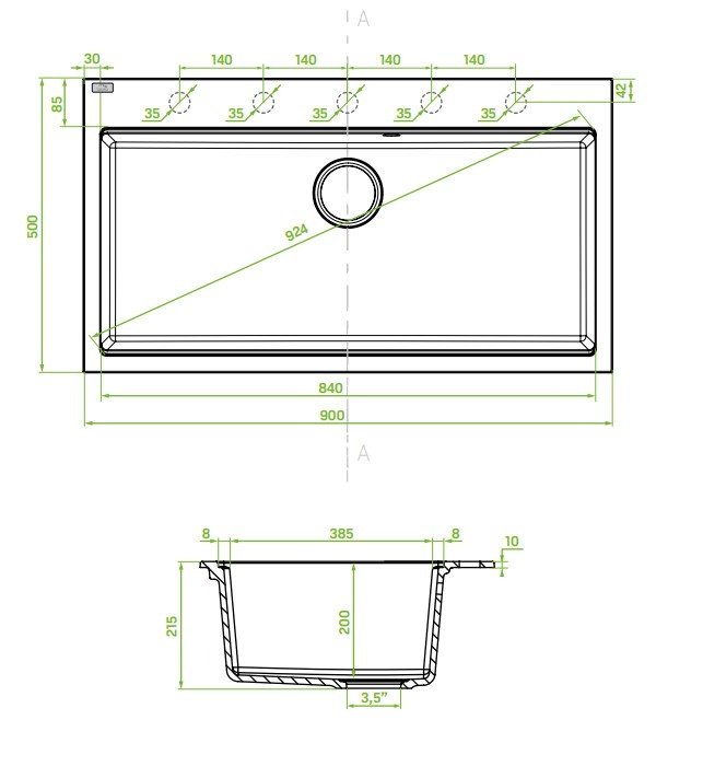 Materiál: Granitový kompozit – vysoká odolnosť voči teplotám, nárazom, poškriabaniu, zafarbeniu.