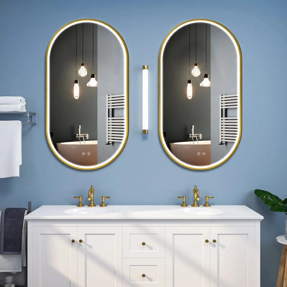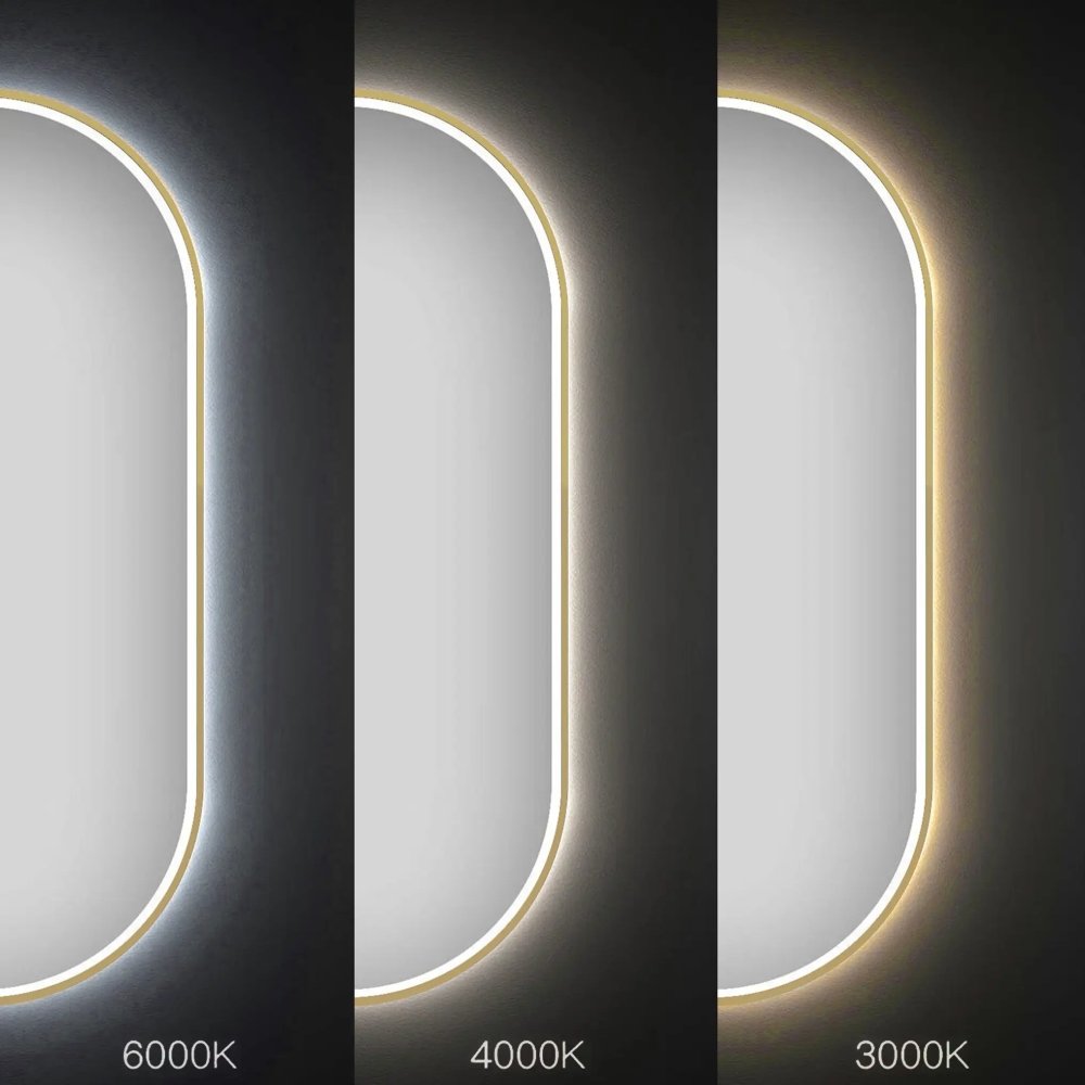 Elegantné LED zrkadlo do kúpeľne – model OVL s rozmermi 50 × 100 cm v zlatom brúsenom prevedení je štýlový a zároveň praktický doplnok pre modernú kúpeľňu. Ovlálny tvar ponúka veľkú zobrazovaciu plochu, ktorá zlepšuje viditeľnosť pri líčení, holení či úprave účesu. Zrkadlo je vybavené integrovaným LED osvetlením, ktoré vytvára rovnomerné svetlo a je ovládané dotykovo – svetlo je možné nastaviť v troch farbách: teplé, neutrálne a studené. Pomocou dotyku sa dá regulovať aj intenzita svetla podľa vašich potrieb. Produkt je vybavený aj funkciou proti zahmlievaniu povrchu (anti-fog), ktorá zabezpečuje stále jasný obraz aj po horúcej sprche.